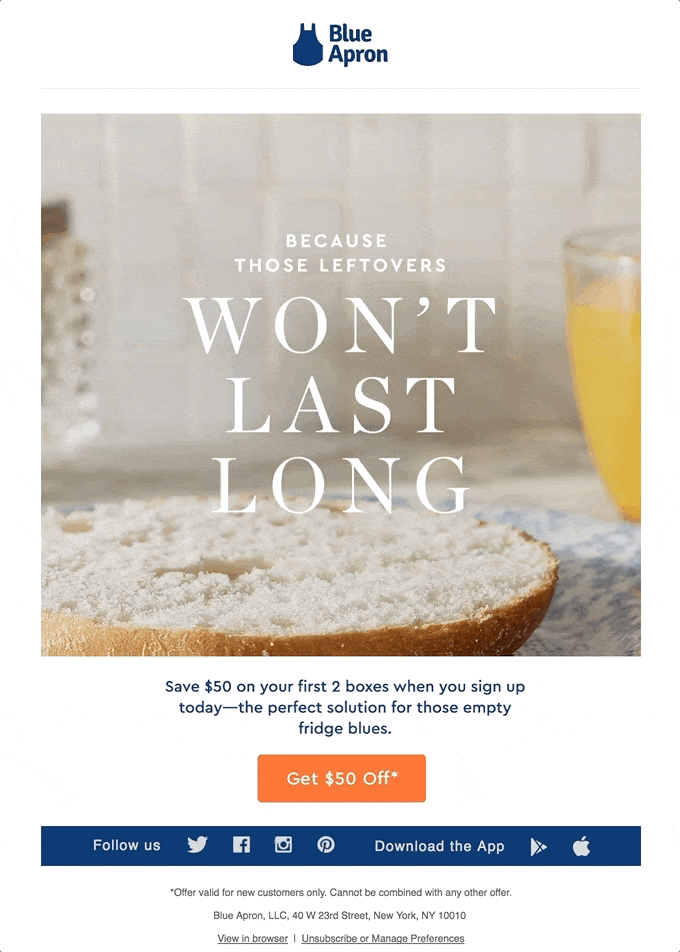 Apart from nailing this mouth-watering GIF, Blue Apron is known for its mouthwatering food designed emails. The food grabs you, and then the headline guides you to where you need to be.