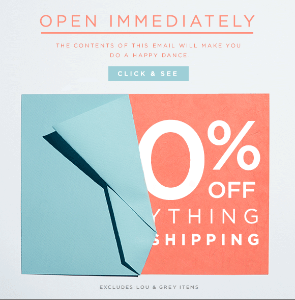 The Loft has mastered building anticipation and sneak peeks in their emails, pushing the reader to run straight to the CTA that says “Click & See” to see what their mystery discount might be.