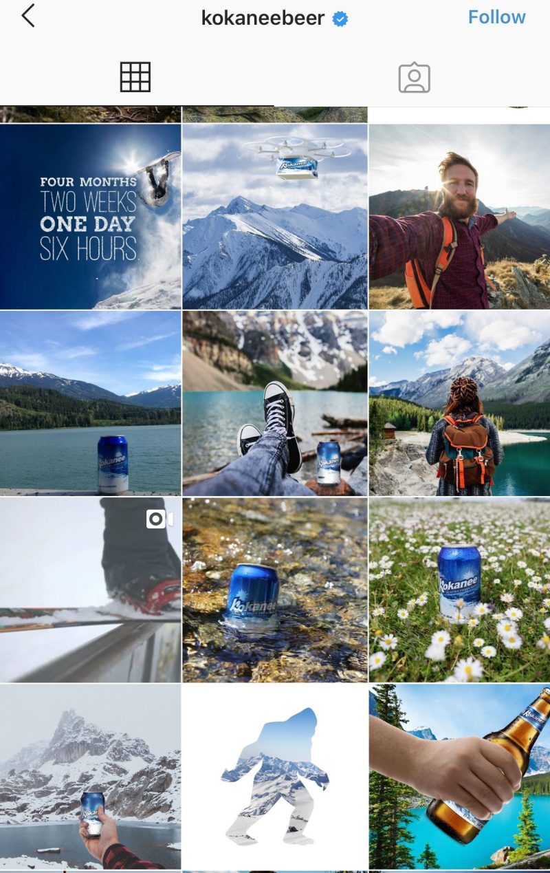 Canadian beer brand Kokanee knows that an overall brand look can be as compelling. Each post contributes a solid identity: distinctly Canadian and northern, their brand photos send a message and create a community aesthetic without saying a word: this is an outdoorsy beer for adventurous explorers.