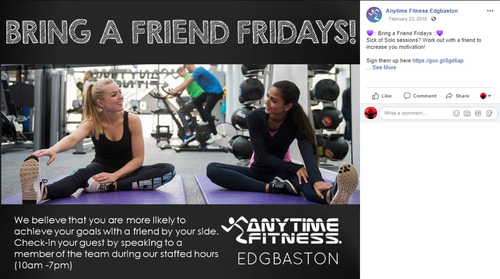 Ask new gym members to bring a friend and get 50% off the first month’s gym membership. Some people are shy about going to a new gym. Bringing a friend can encourage people to show up, work out, and have fun.