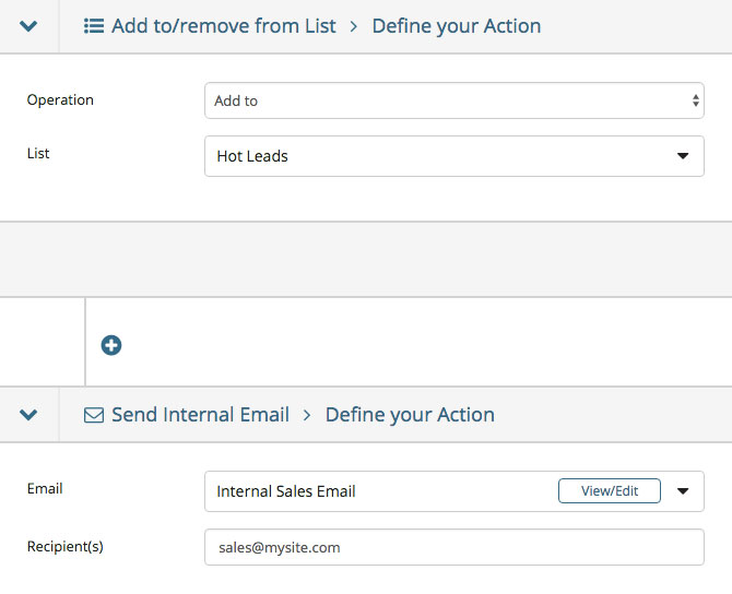When someone matches this condition, I want to send an email to my sales team to let them know this person is a hot lead, and add them to the list “Hot Leads” so we can keep track of them. We’ll set these events as two separate actions, like this: