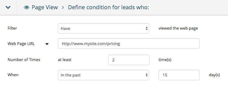 After creating a new blank workflow, you’ll want to set your conditions based on the hot lead qualifier you’ve chosen. For this example, I’ll say anyone that’s visited the pricing page twice within the last 15 days is a hot lead. Based on this, I’ll set a Page View condition that looks like this: