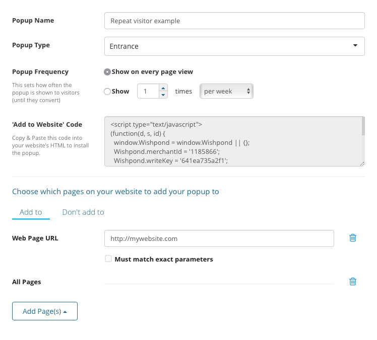 Once that’s done, you’ll move into your publishing options. I’d recommend an entrance popup for this repeat-visitor popup to ensure they see it, but a scroll or timed popup would also be good choices. You’ll want to add it to “All Pages” so it’ll trigger only on pages that have the popup code installed. Speaking of that code – copy that somewhere, since we’ll be using it in just a sec. Here’s what my publishing options look like: