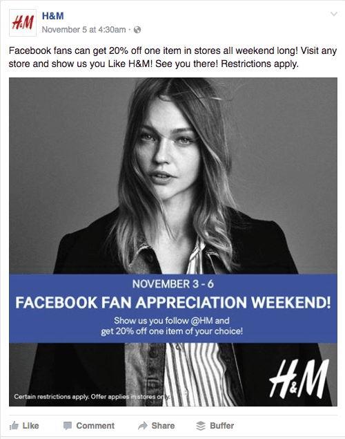 As you can see in this post from H&M, people wanting 20% off from H&M need to show that they like the H&M page on Facebook – that’s a sure way to increase Facebook likes.