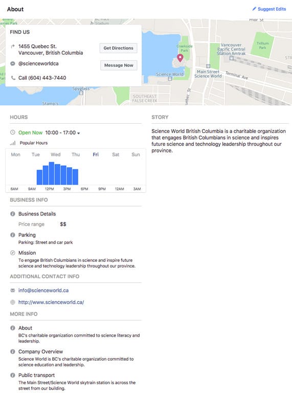 Make it easy for readers who visit your Facebook page (and increase Facebook likes) to learn about your business by filling out your about page. Include your opening hours, location and contact information, and a short blurb of information about your business.