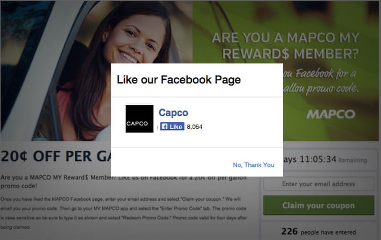 Just like with the Facebook Contest App mentioned in the previous section, you can add a “Like” popup to your coupon, as seen in the example below.