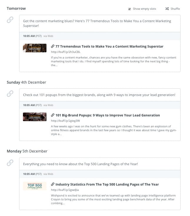 I know first-hand how tough it can be to maintain a consistent queue of content for your Facebook page. Thankfully, tools like Buffer make it easy to schedule content days – even weeks – advance so you don’t need to worry about it. Take some time every few days to schedule posts (at optimal times) to go out to your fans, showing them that your page is consistently active and full of great content.