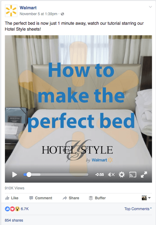 For example, a clothing brand may post something like “how to style this jacket”, or a local grocery might highlight a tasty recipe for a new marinade. Here’s an example from Walmart, showing their followers how to make the perfect bed: