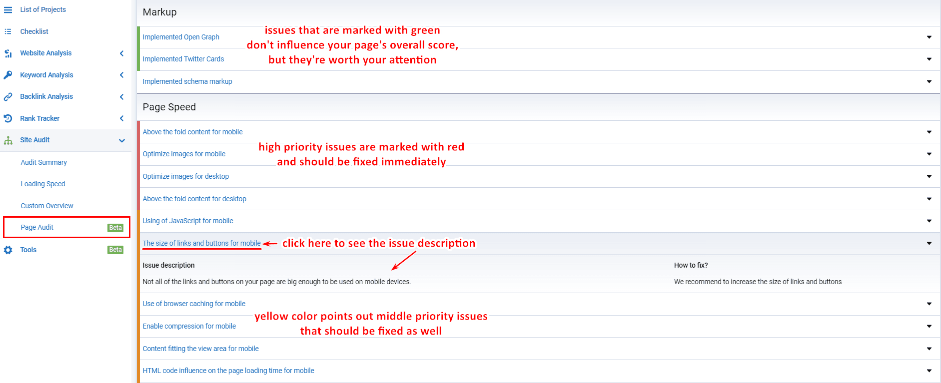 All you need to do is to add the URL in the Page Audit section and wait for the results. The report will estimate how well your page is optimized and point out the existing technical errors.
