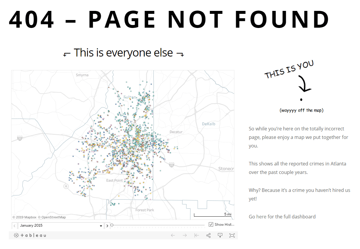 The page 404 shows you a detailed report of Atlanta’s crime rate from January 2015, because it’s a crime that you haven’t hired them as yet. Another amazing way to soft sell your services to visitors.