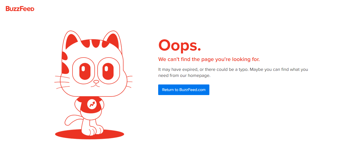 You can always keep it simple. Buzzfeed did, with its cat mascot wagging its tail back and forth to let you know that either something’s missing or you made a typo.