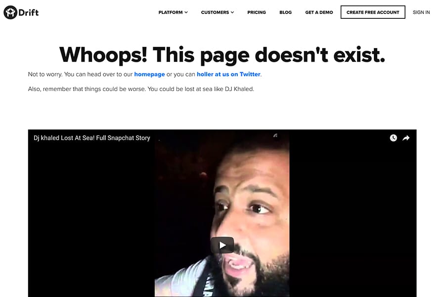 Drift’s 404 page is one of the most fun ones we’ve seen. Misdirected users are greeted by an embedded video of DJ Khaled lost at sea.