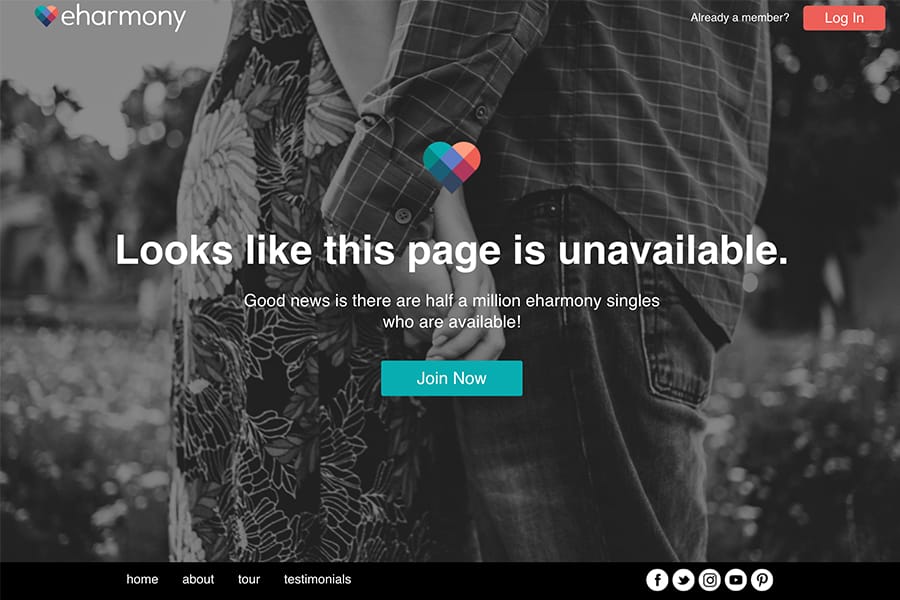 Your 404 page can even be an opportunity to soft sell your services. That’s what eharmony did with its 404 pages.