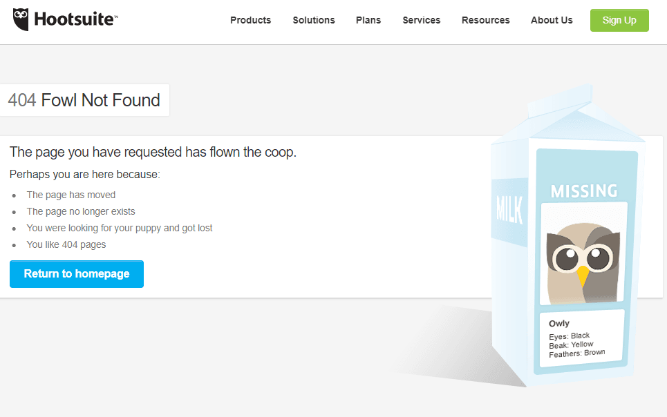 Still not sure how to design your 404 pages? You can incorporate your business logo or brand mascot in the design. Take Hootsuite, for instance: for their 404 pages, they showed their mascot, Owly, missing on a milk carton, along with reasons why this page could be missing.