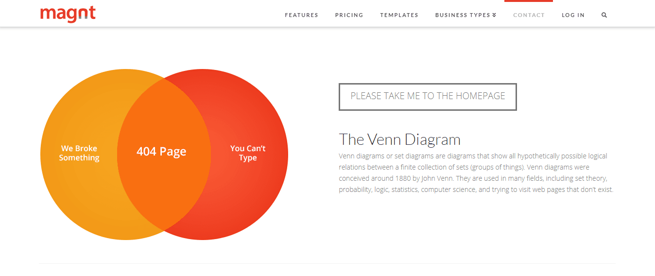 Listed by CNBC as one of the Internet’s Best 404 Error Pages, Magnt boldly tells it like it is: either you don’t know how to type, or they broke something. You get to decide which one’s the cause of your 404-page error.