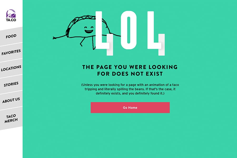 Taco Bell is a brand that has mastered the art of being funny and yummy at the same time. It’s page tells users that the page they were looking for does not exist – unless they were looking for an animated taco.
