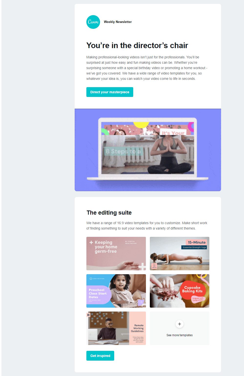 - Be inspiring, not selling: In the example above, Canva inspires recipients and reminds them of their potential to do more. With that, people are more open to read about the next topic that the email talks about: The Editing Suite.