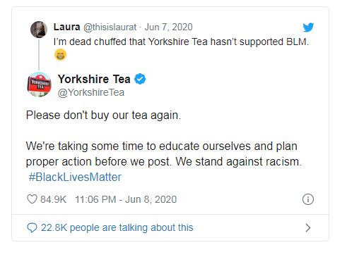 Yorkshire Tea took a strong stand in the ongoing Black Lives Matter (BLM) movement, going to the extent of even asking customers to distance themselves from their brand if they didn’t believe in anti-racism.