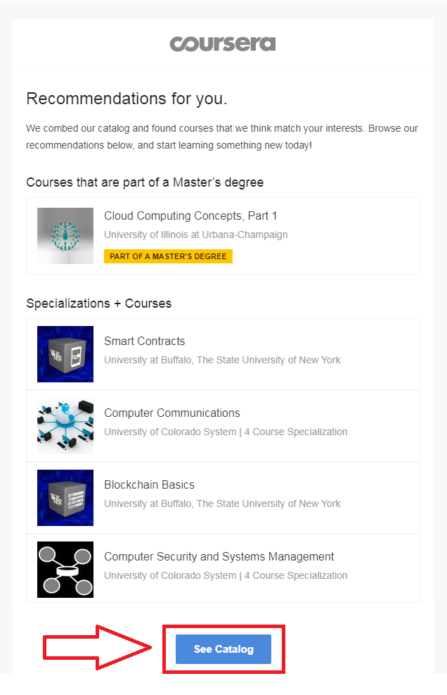 The following email from Coursera focuses on what all recipients can learn. Even the CTA says “See Catalog”, and not “Buy the Course”.