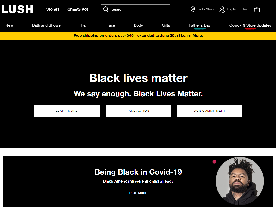 For example, Lush (below) prominently displayed the BLM message. They let this theme overshadow their above-the-fold product display, clearly showing a few things mattered for them way above business.