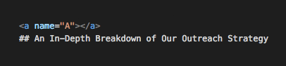 You’re also going to need to do a couple of things to make it interactive. First, you’re going to need to add anchor tags to each section you want to link to from your table of contents. I’d recommend adding these tags right above the heading you’re linking to. Here’s what an anchor tag looks like: