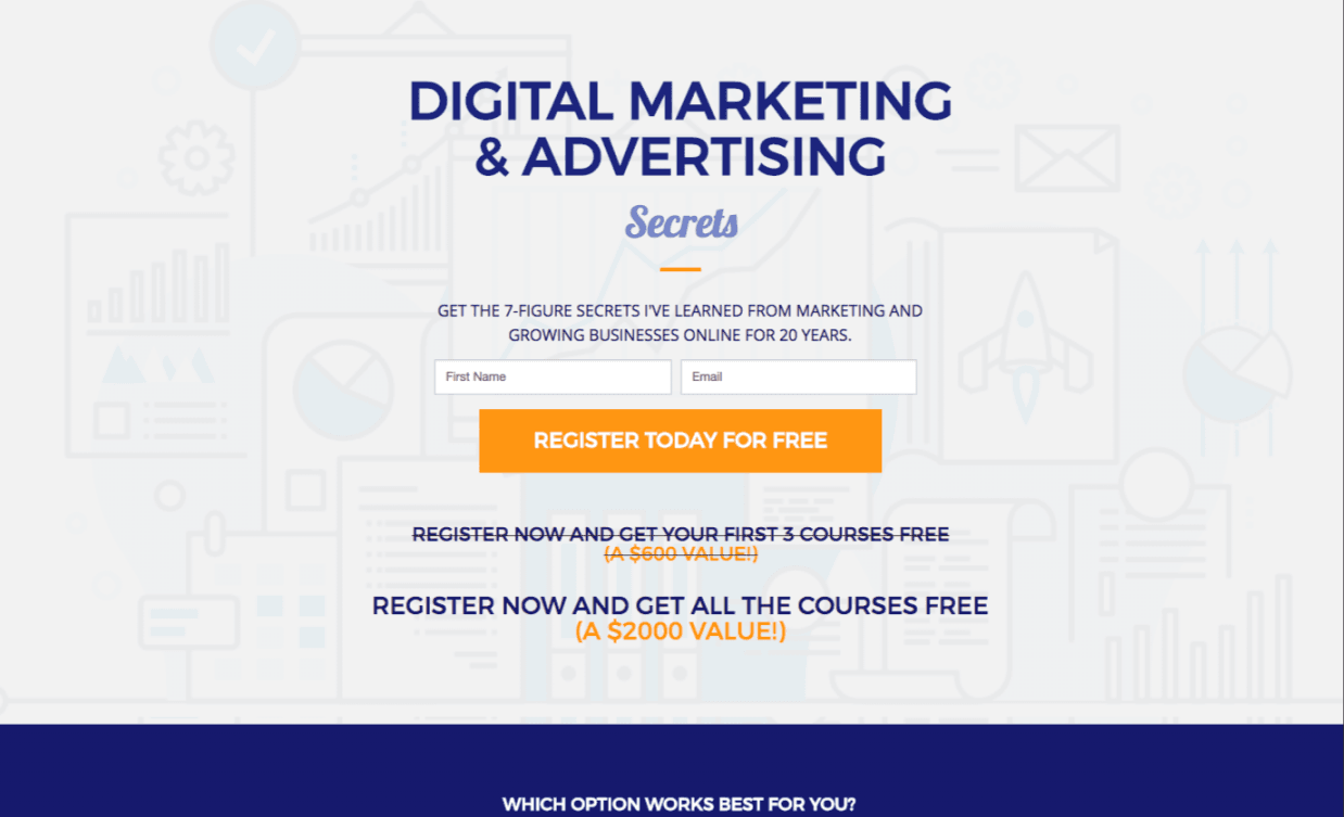 - A unique selling proposition: Be sure to make it clear (ideally, in the landing page headline and subheadline) what makes your online course different from others. What are you offering which nobody else is? In the case of my course there are three elements: 1) “Secrets” communicates things you haven’t heard before. 2)”7-Figure” communicates proven results and 3)”For 20 Years” communicates experience. All of these elements communicate value it may be hard to get anywhere else.