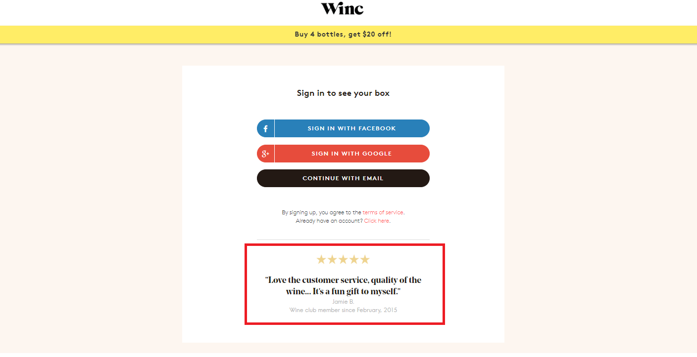 To make potential shoppers sign up, Winc features an existing customer review and a five-star rating to give potential shoppers the final push and turn them into customers who will enjoy their product.
