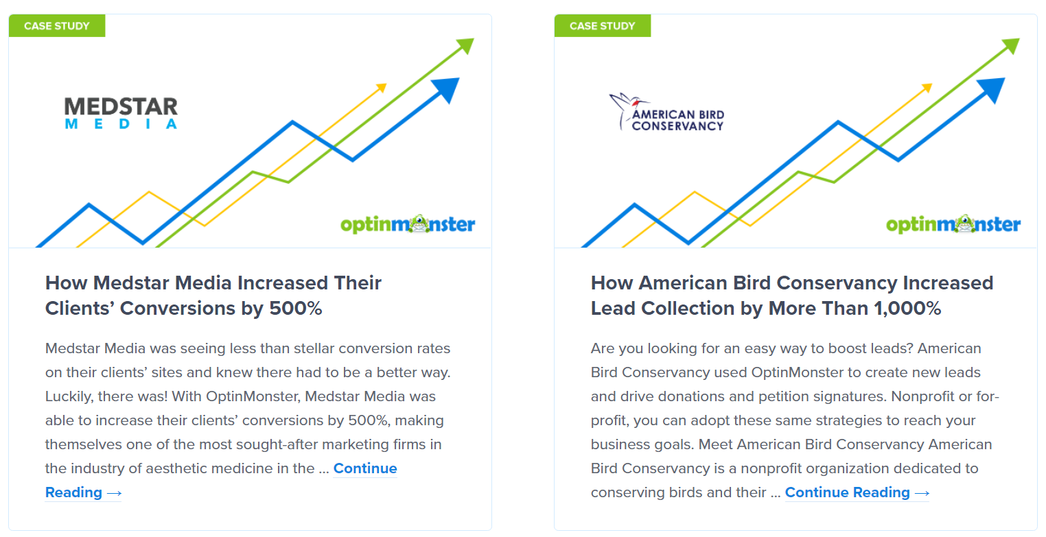 Publish blogs and case studies to ensure customers that they are getting the best. For example, Optin Monster publishes case studies to show customers that their product works and is worth investing in.