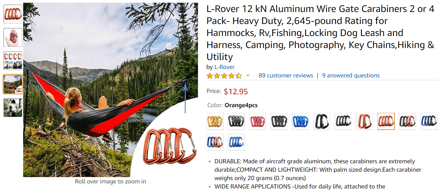 The above picture illustrates how you can use their carabiners to secure a hammock, and they’ve also got other pictures showing how you can use the same product in other ways.