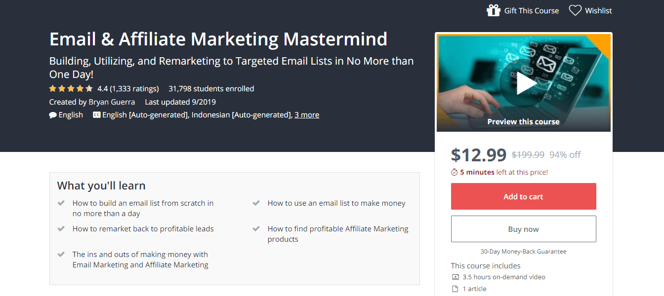 It’s very rare to find a good email marketing course that’s specialized in affiliate marketing on Udemy. This course was highlighted as a go-to for email marketers by One-Click Lindsey herself.