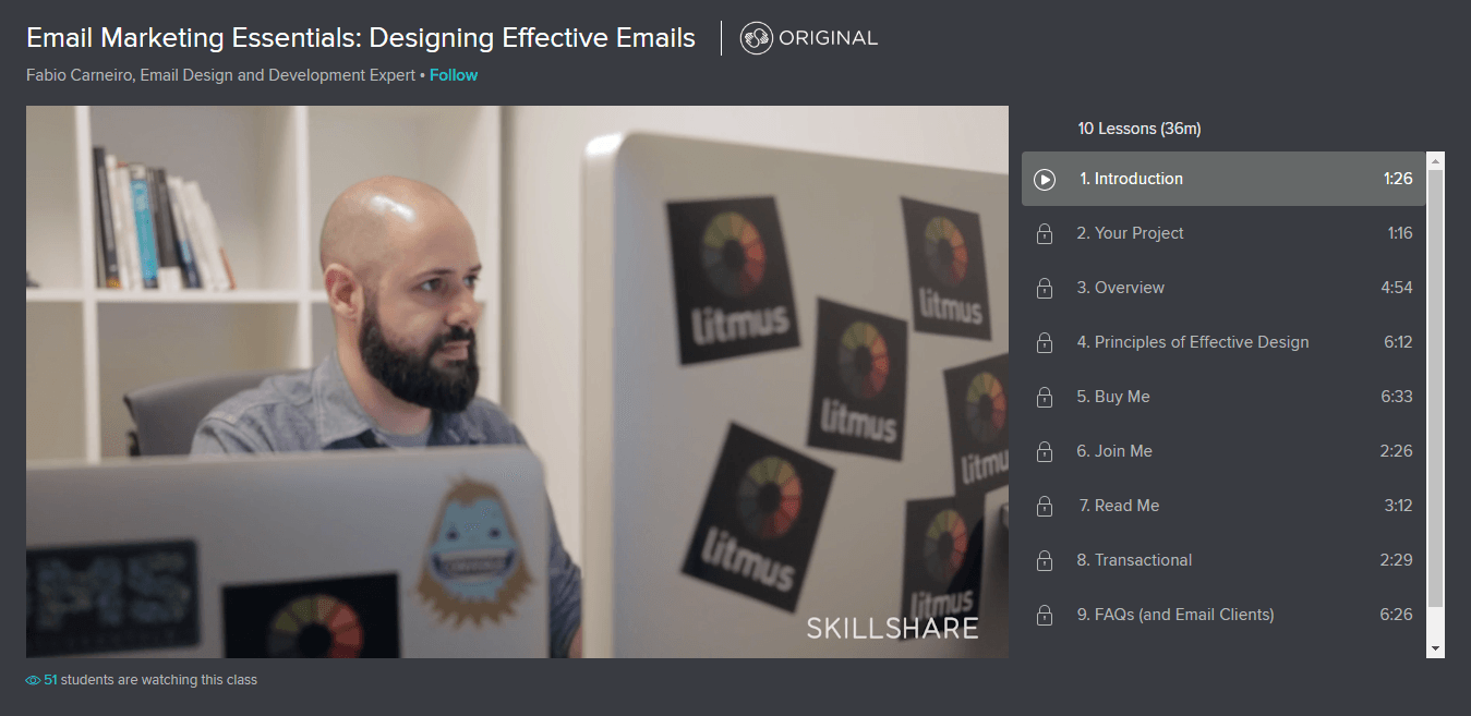 If you’re more interested in mastering your email designs than email marketing campaigns, I found Fabio Carneiro’s Skillshare class on designing effective emails to be the perfect fit.