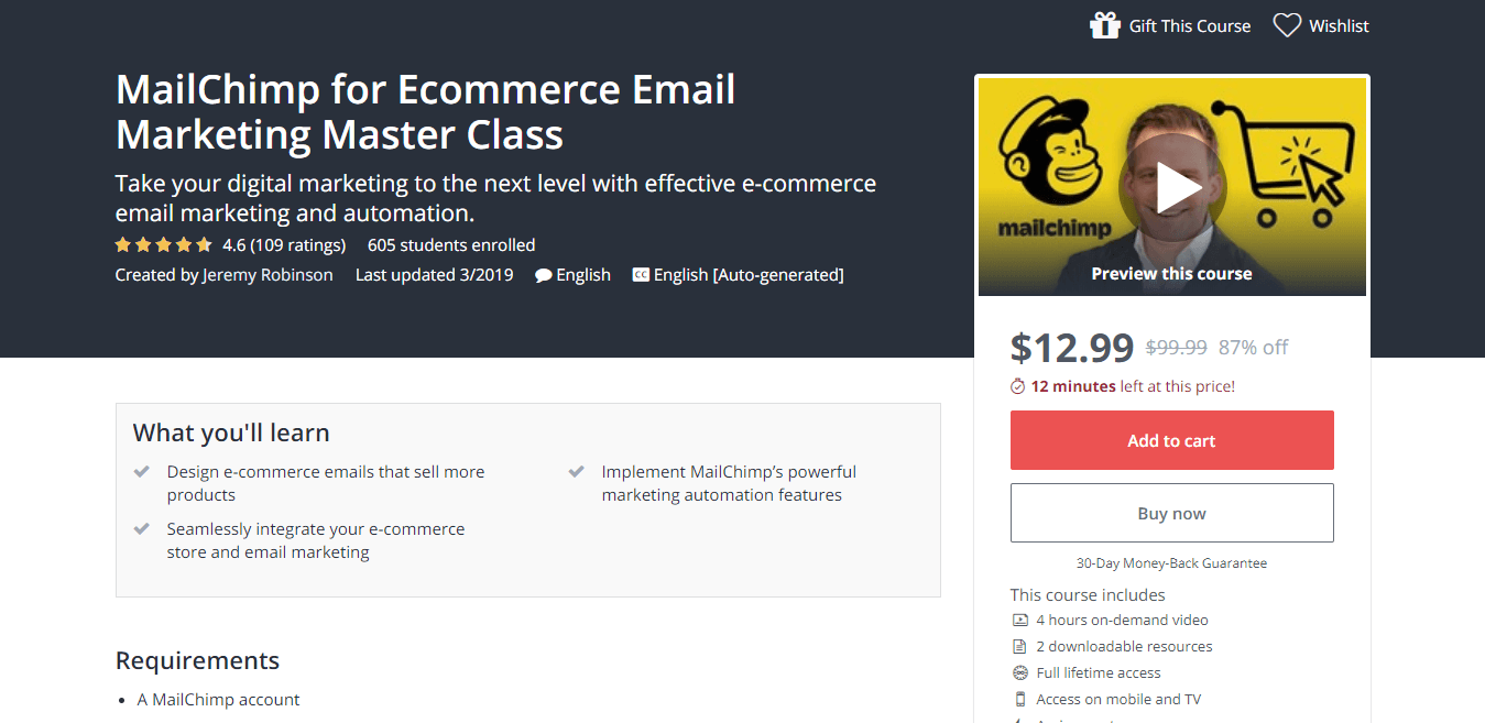 This Udemy course was created by Jeremy Robinson, a seasoned marketer with ten-plus years of experience, teaching students how to master MailChimp for an eCommerce business.