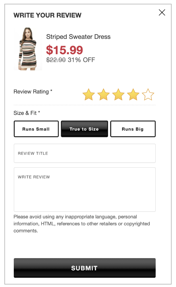 Look at this product review email by Forever21. It’s sent a few days automatically after a customer’s order is delivered. The customer can click on their product and quickly submit reviews for their favorite products.