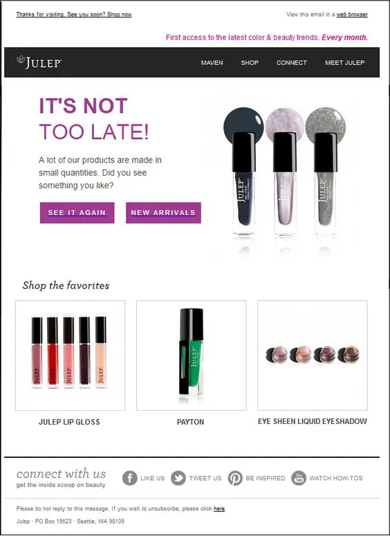 You can also recommend products based on abandoned carts or their browsing history. Check out this example of a product recommendation email by Julep: