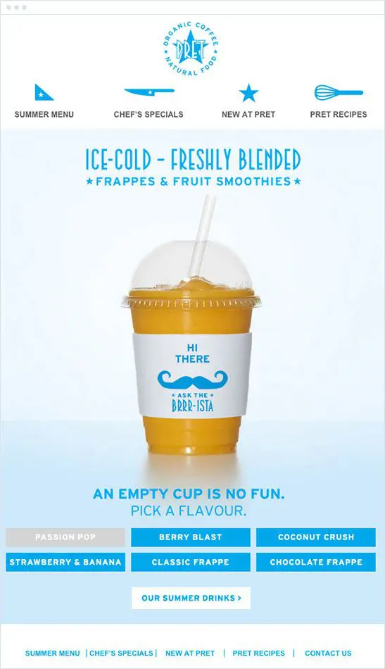 Here’s a really cool example of Pret using interactive emails. The drink changes colors as you toggle through the flavors: