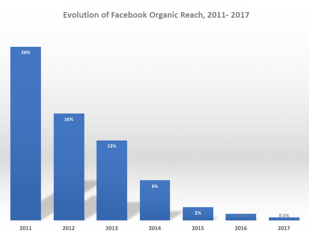The graph below is a nice illustration of just how much social media organic reach has dropped over time. You can see, if you ran an influencer marketing campaign back in 2011, your content would have reached a lot more people than it will do today. This reduction in reach over time is something I always discuss in my social media training sessions.