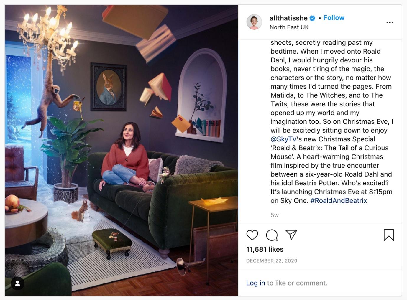 For instance, Sky TV gave influencers plenty of freedom to promote their Christmas Special, “Roald & Beatrix: The Tale of a Curious Mouse.” You can see AllThatSheIs came up with interesting visuals for her account.
