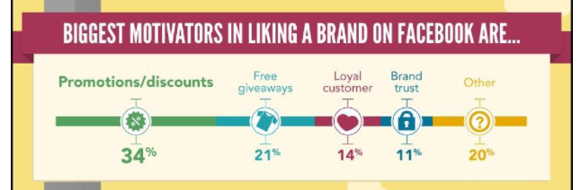 Discounts are the greatest motivator for Facebook users to Like a brand page. In 2012 (and I doubt it’s changed much since then), Mashable found that 34% of Facebook users were motivated by “Promotions & Discounts.” 21% (the second-place motivation) cited “Free Giveaways” as their motivation: