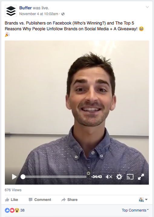 The social media wizards over at Buffer use the full gamut of video on their Facebook page. Live chats, streaming, and high quality video content make an appearance weekly on their feed.