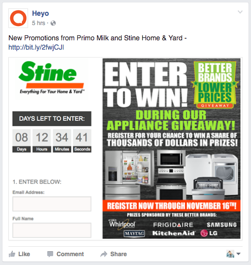 The social contesting platform Heyo shows off successful clients on their Facebook page for their followers to witness. This includes a compelling case study. Highlight the customer and demonstrate value with concrete examples and engagement will come.