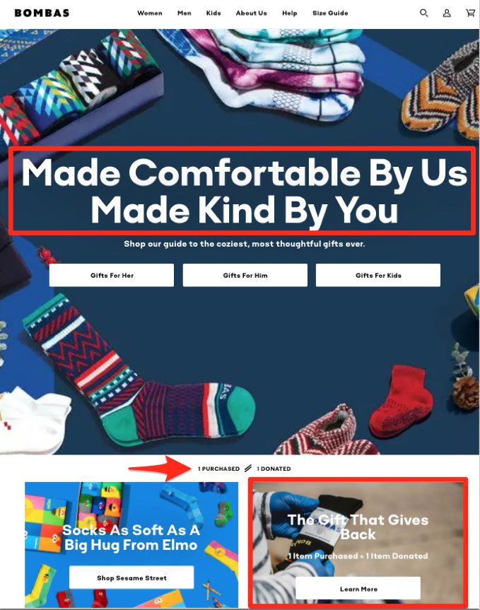 Their bold messaging of “Made Kind by You” helps customers realize that making a purchase through them also helps someone in need. This model made Tom’s shoe brand famous, and it’s steadily doing the same for Bombas.