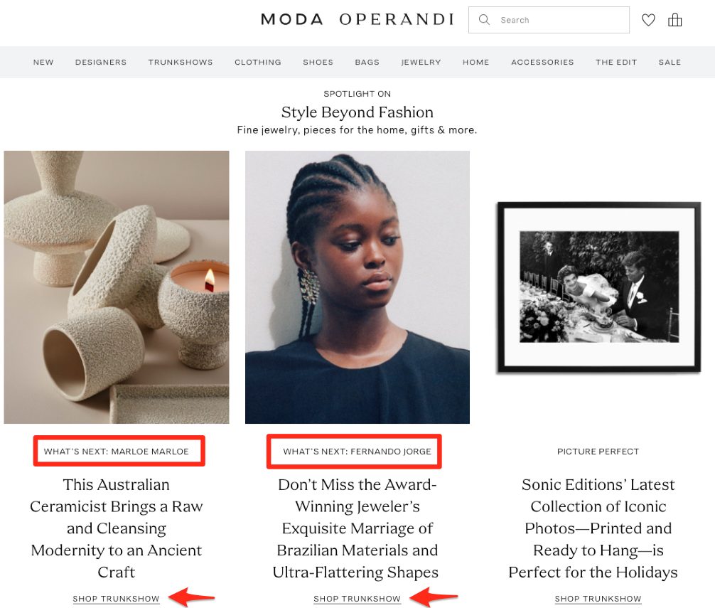 MODA OPERANDI, another high-end fashion website for women, uses their website space to highlight the next fashion trends. Buyers hoping to stay on the cutting edge regularly visit the site for up-and-coming merchandise: