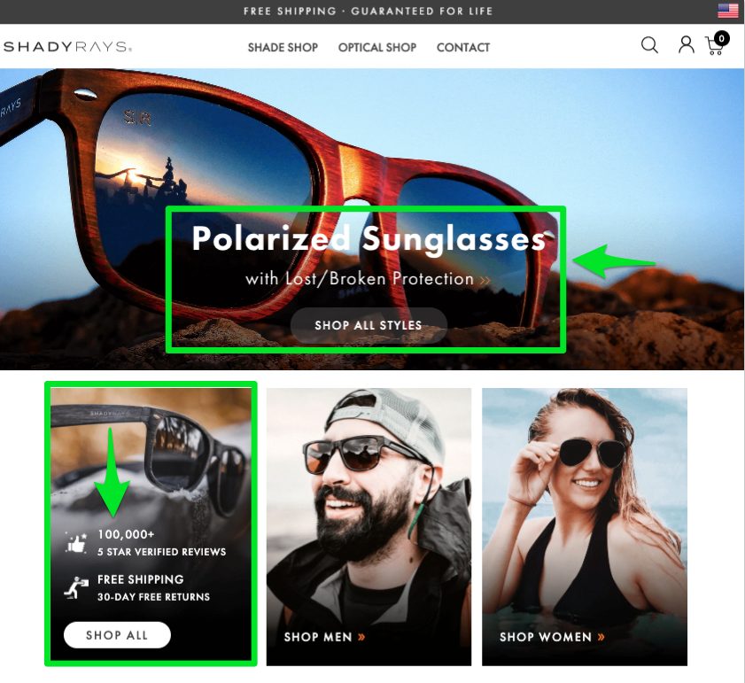 Polarized sunglasses line Shady Rays puts their unique selling points upfront on their homepage for browsers to see as soon as they land on their page: