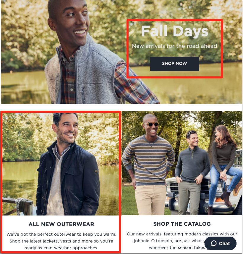 With their models posing in front of eye-catching fall backgrounds, their big, bold images show off their products “in the wild” and in-season. The messaging also connects their products with the time of year: the Fall Days and All New Outerwear collections are exactly what customers want during this season.