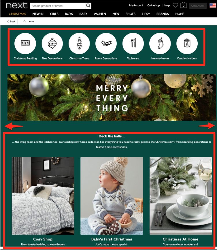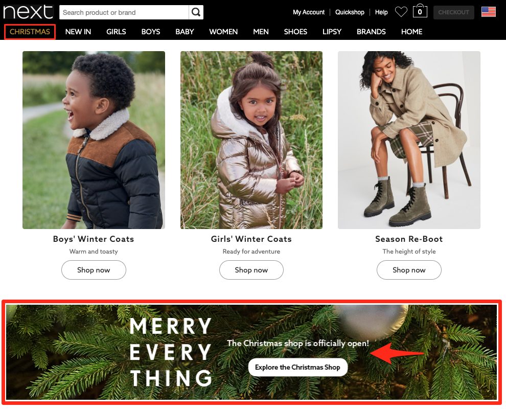 Like UO, the marketing team at family clothing brand Next added a Christmas tab to the top of their navigation. But they went a step further than UO by changing the tab’s font color to yellow so it stands out. Next then added a holiday banner down the page to welcome shoppers to the season: