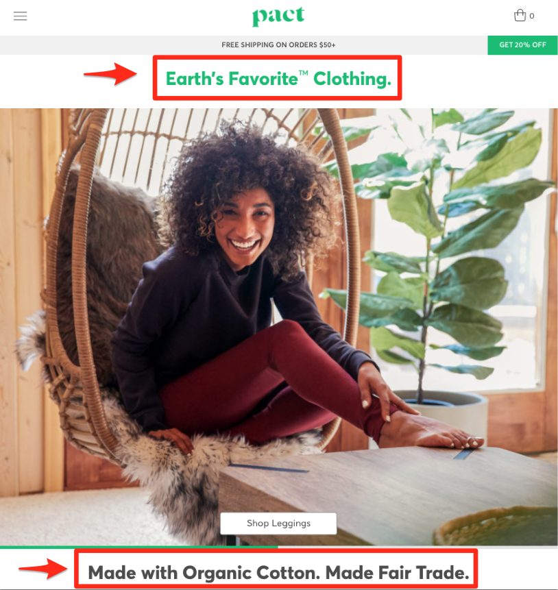 When browsers land on their website, they’re instantly greeted with a 20% off discount and free shipping. They also learn in the description that Pact clothes are both organically made and fair trade. This eco-friendly message is further reinforced throughout its homepage: