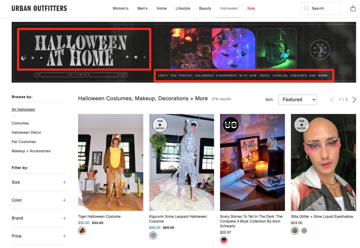 Popular retail chain Urban Outfitters (UO) doesn’t go all-out with Halloween promotions on their homepage. Instead, they chose to tuck a Halloween tab into their main menu navigation, which takes browsers to all their Halloween offerings: