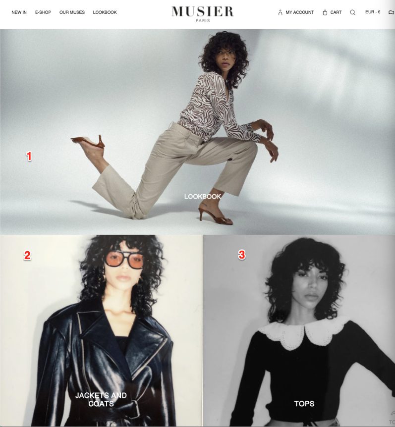 Our next example from Parisian fashion line Musier is less about mimicking a marketing strategy and more of an aesthetic tip. You’ll notice in the image below that Musier uses a mix of three different photo styles on their homepage: