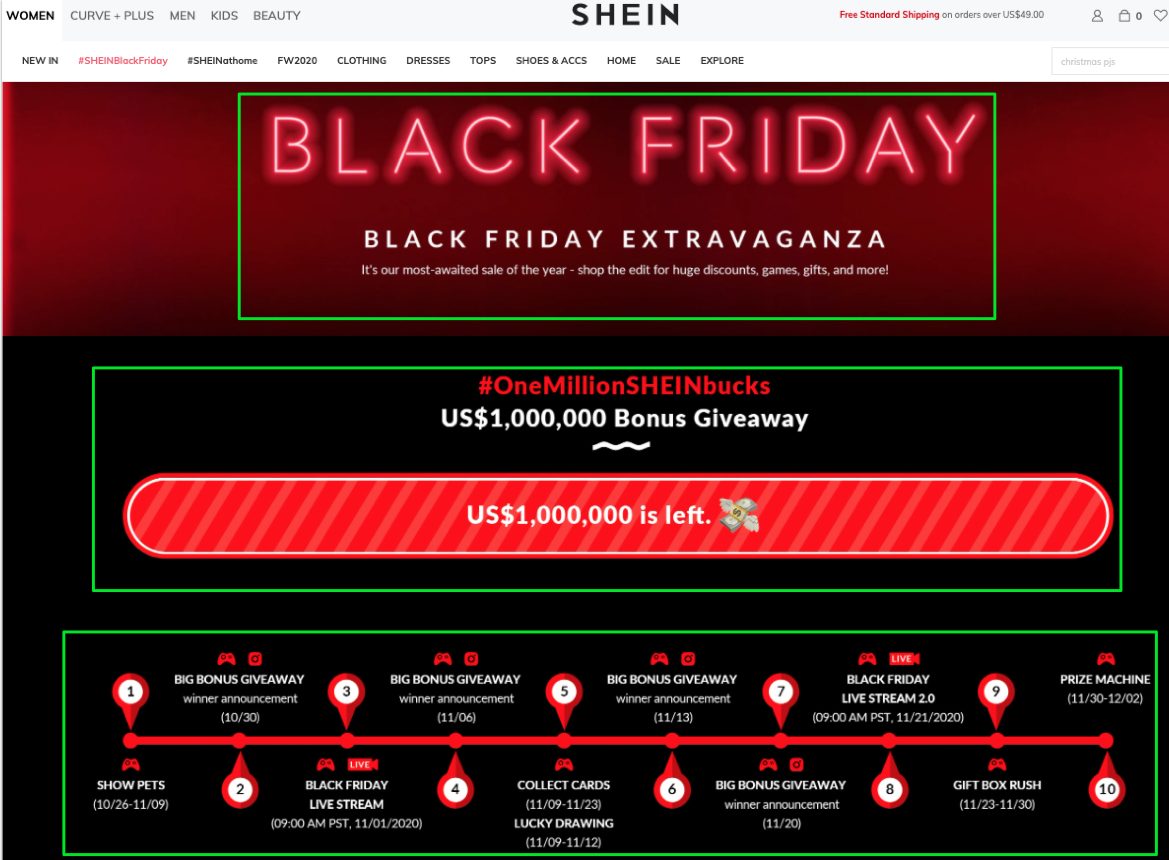 Click the #SHEINBlackFriday tab, and you’re directed to the Black Friday Extravaganza page, which includes all their giveaways and events leading up to Black Friday: