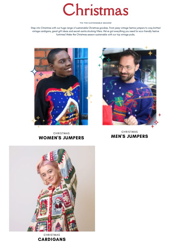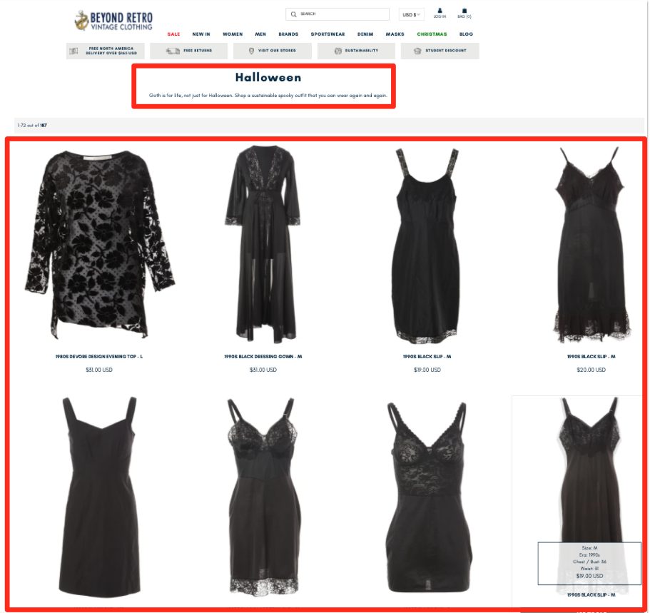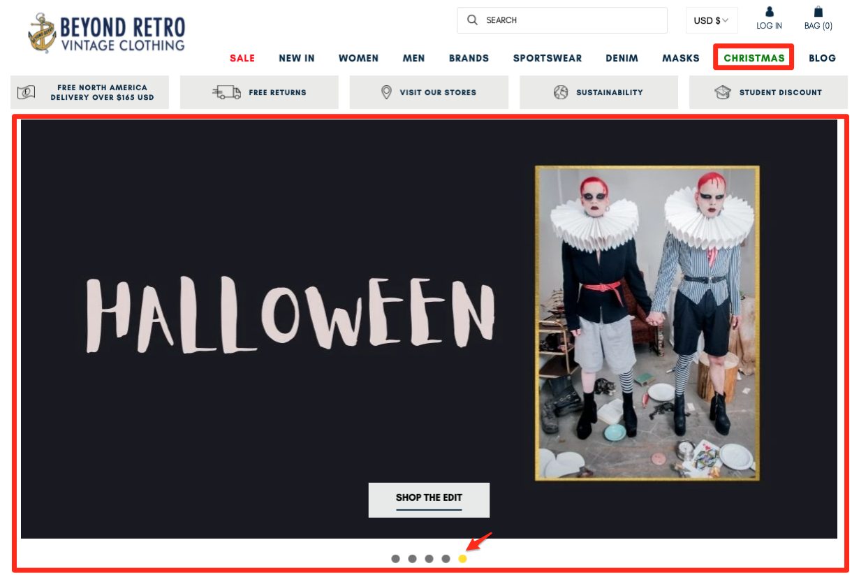 Vintage Clothing brand Beyond Retro took a double holiday approach by promoting Halloween and winter festivities at the same time. You’ll see a Halloween banner on their main homepage slider and a Christmas tab in their top navigation: